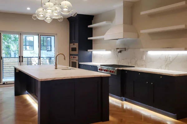 A high-end renovation is also a full gut, but the distinction from mid-range is the level of customization and finish quality. Fully custom cabinetry and millwork, premium stone surfaces, high-specification or integrated appliances, and a design-forward approach where every detail is intentional. The investment reflects both the materials and the complexity of execution.